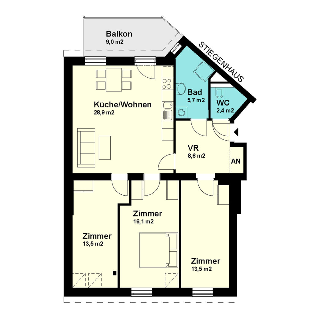 2-Zimmer-Küche-Wohnung 2. Obergeschoß / Tür 16 Nutzfläche: 67,7 m2 Balkon: 3,7 m2 + 3,8 m2 Kellerabteil: ja HWB (kWh/m2/Jahr): 49