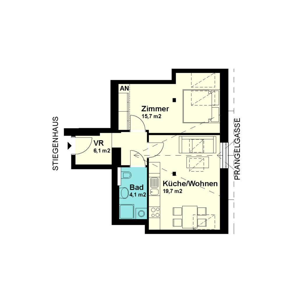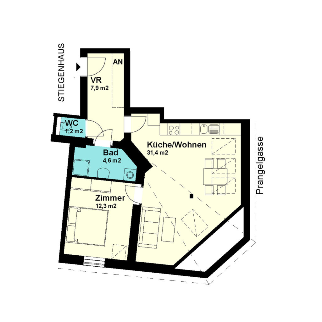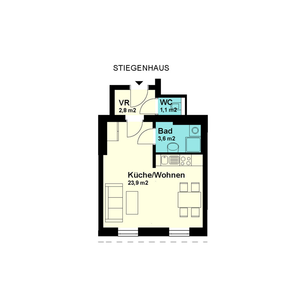1-Zimmer-Garconniere Dachgeschoss / Tür 22 Nutzfläche: 31,4 m2 Balkon: nein Kellerabteil: ja HWB (kWh/m2/Jahr): 49 HWB Energieklasse: B Lage: