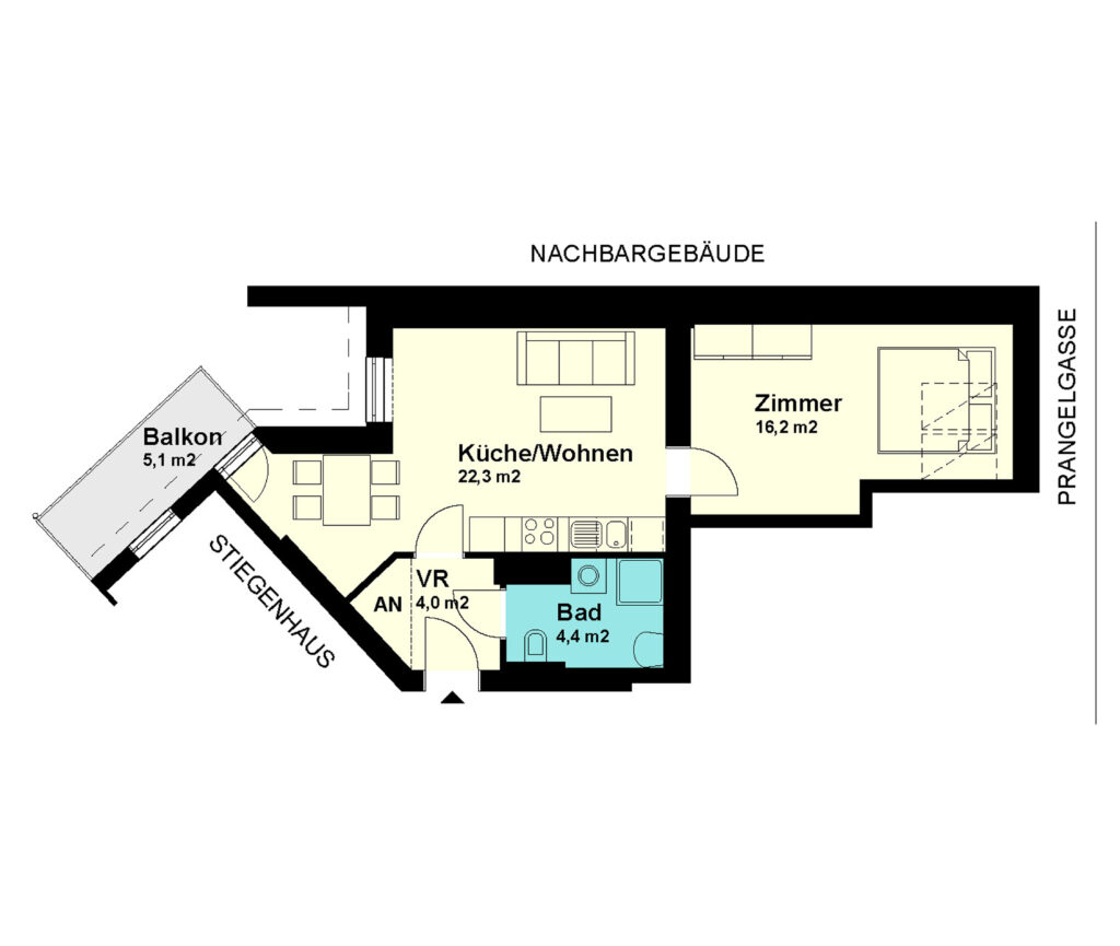Zimmer-Wohnküche-Wohnung Dachgeschoss / Tür 24 Nutzfläche: 45,9 m2 Balkon: nein Kellerabteil: ja HWB (kWh/m2/Jahr): 49 HWB Energieklasse: B Lage: