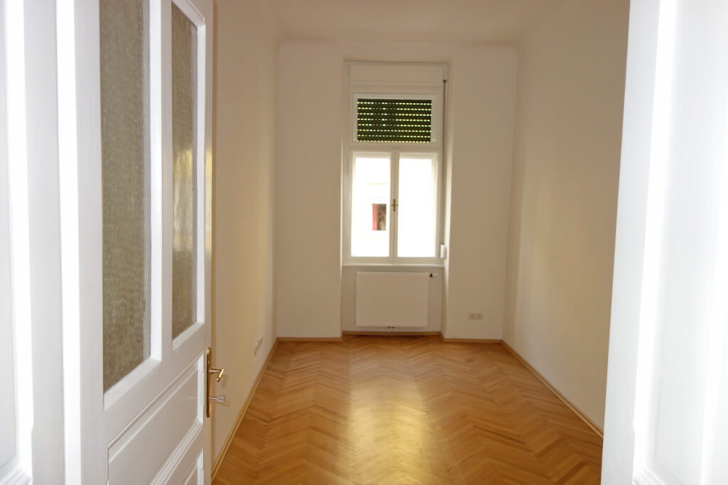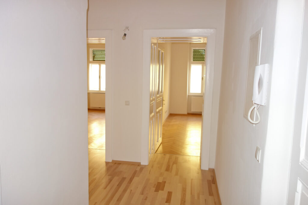 Hohe Räume mit sanierten Altbau Kassettentüren in weiß