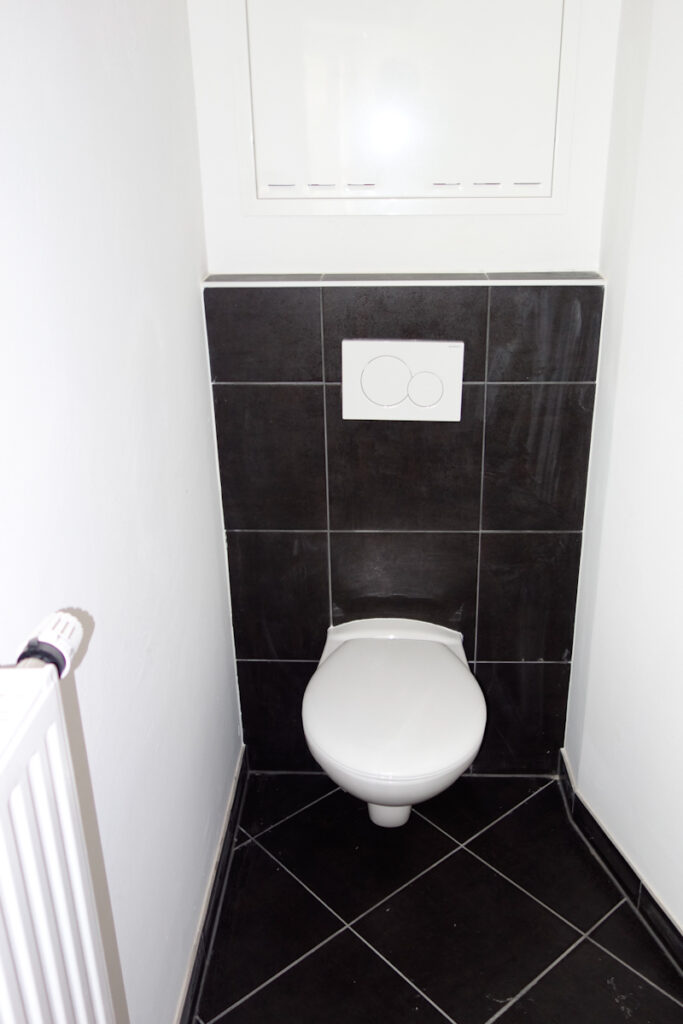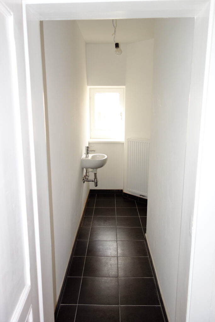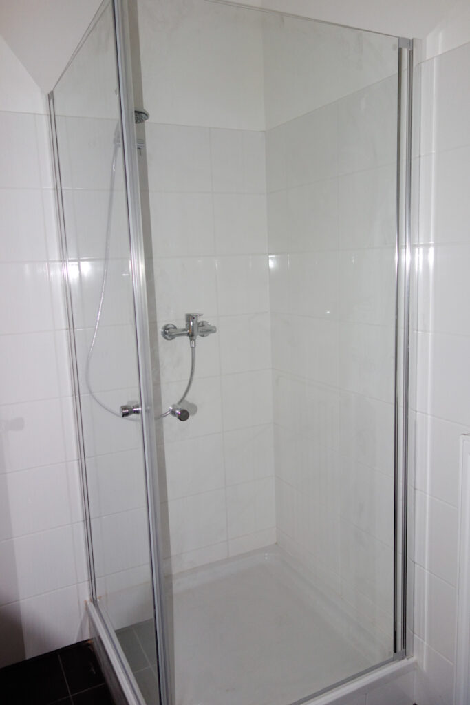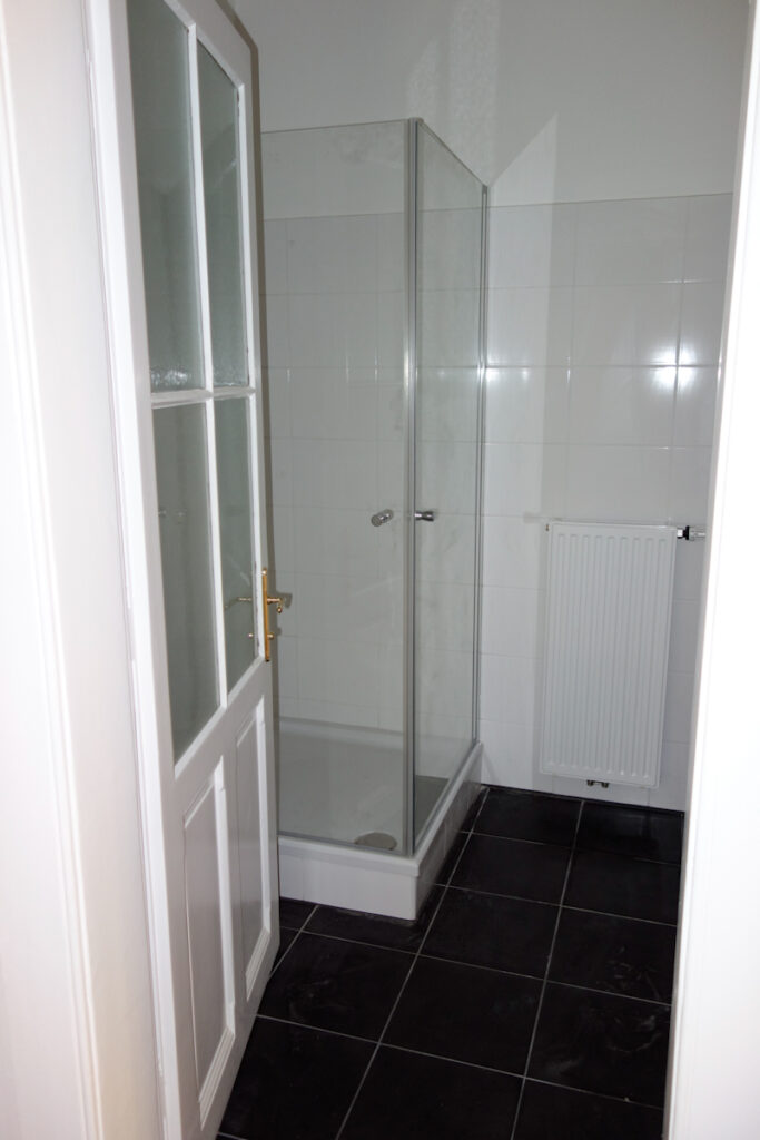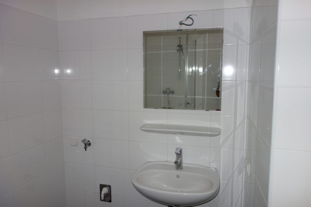 Völlig neu gestaltetes Bad mit Dusche 90/90, Wandfliese weiß, Bodenfliese antrazit, Anschluss für Waschmaschine, seperates WC