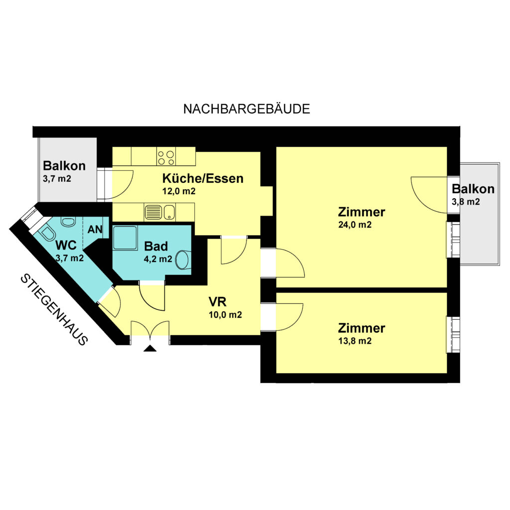 2.Obergeschoß / Tür 16 Nutzfläche: 67,7 m2 Balkon: 3,7+3,8 m2 Kellerabteil: ja HWB (kWh/m2/Jahr): 49 HWB Energieklasse: B