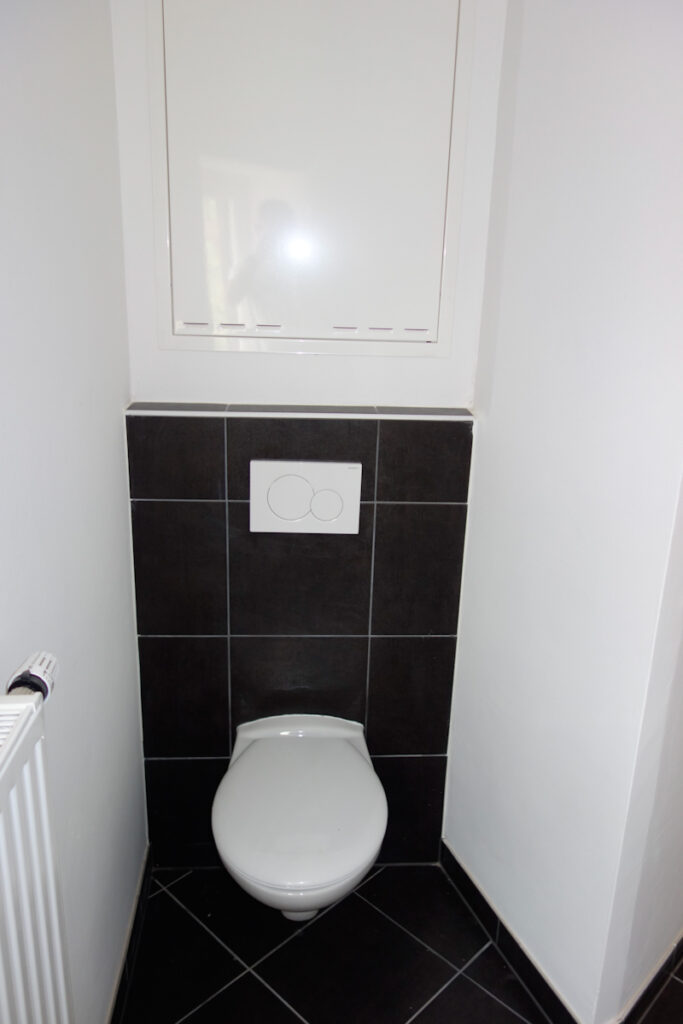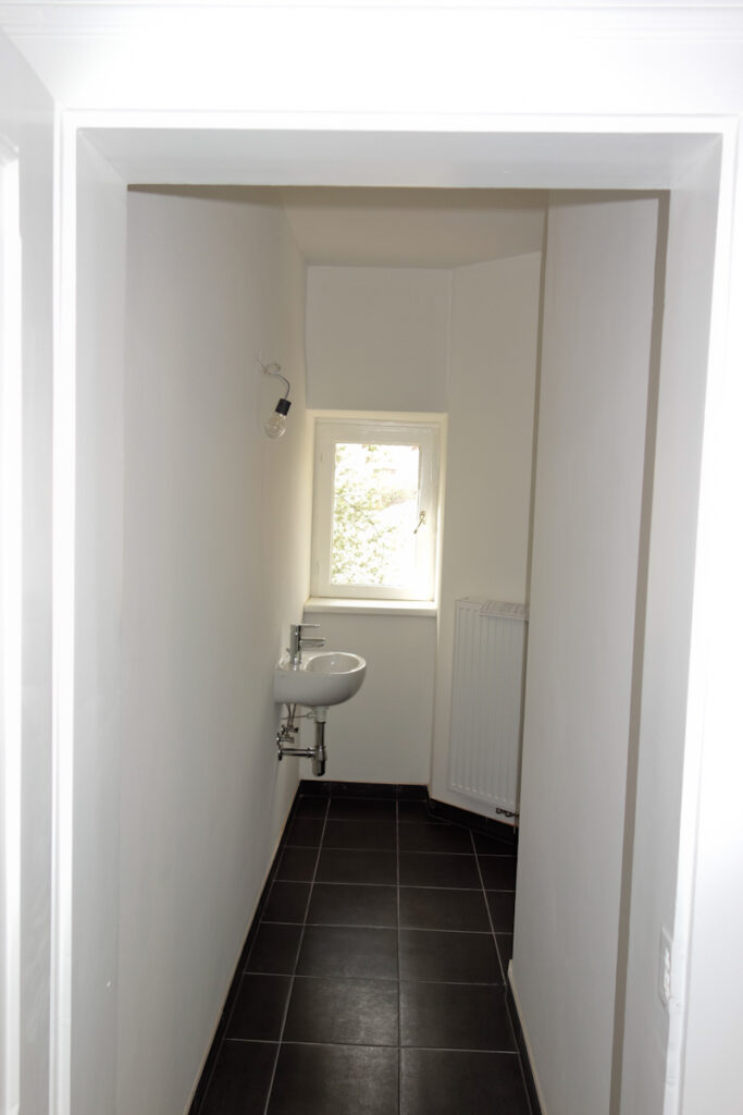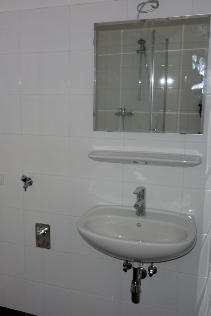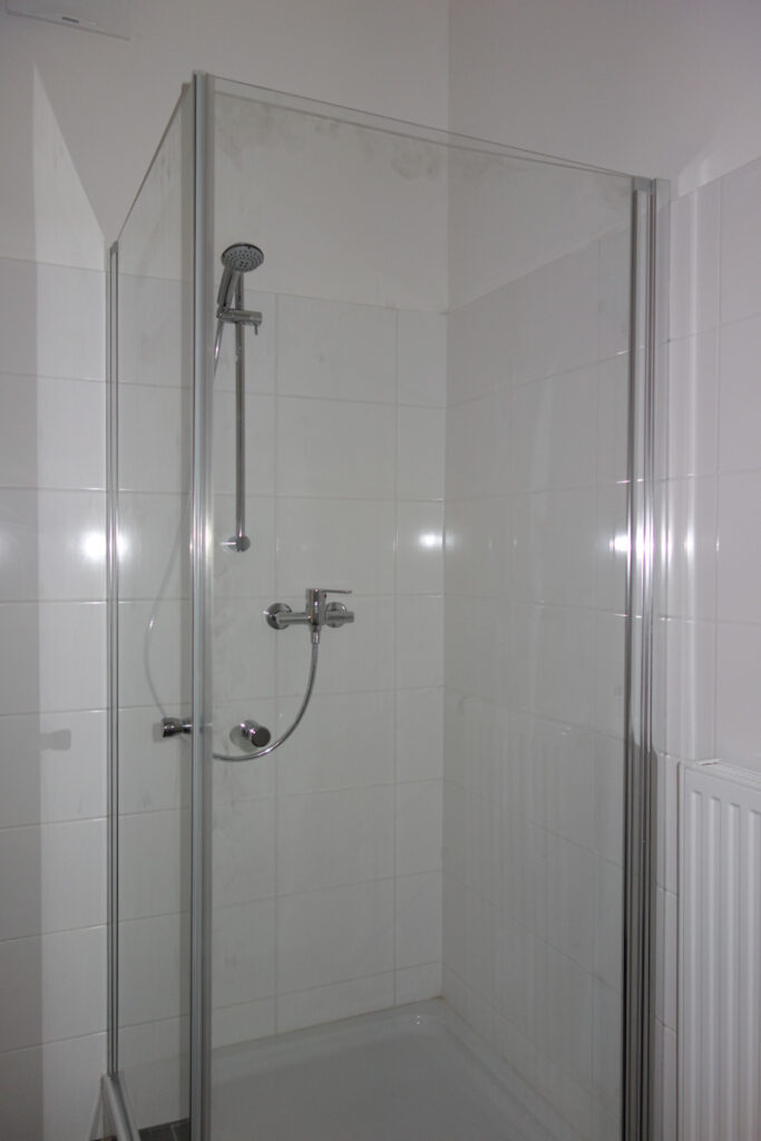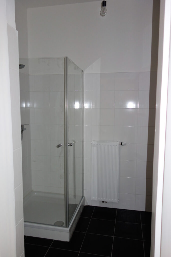 Völlig neu gestaltetes Bad mit Dusche 90/90, Wandfliese weiß, Bodenfliese antrazit, Anschluss für Waschmaschine, seperates WC