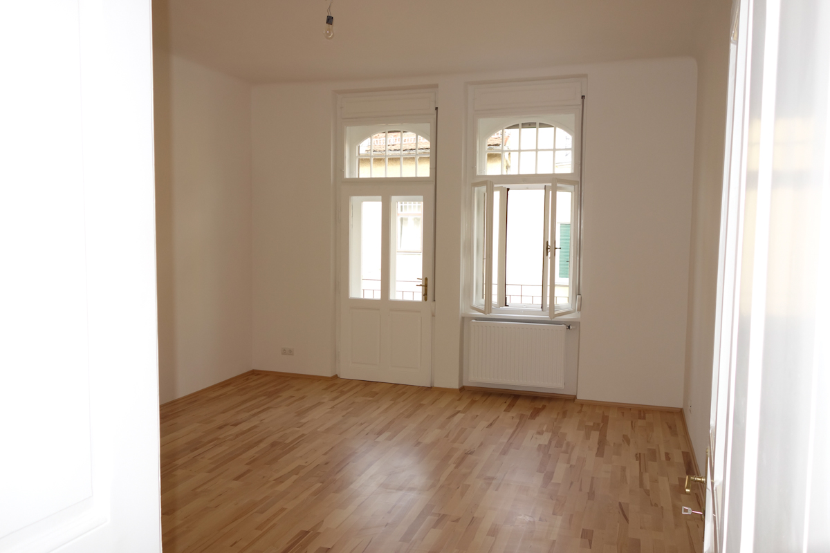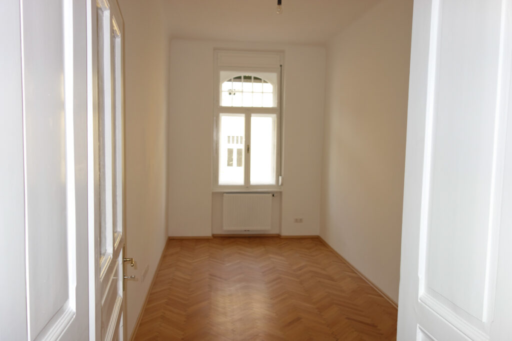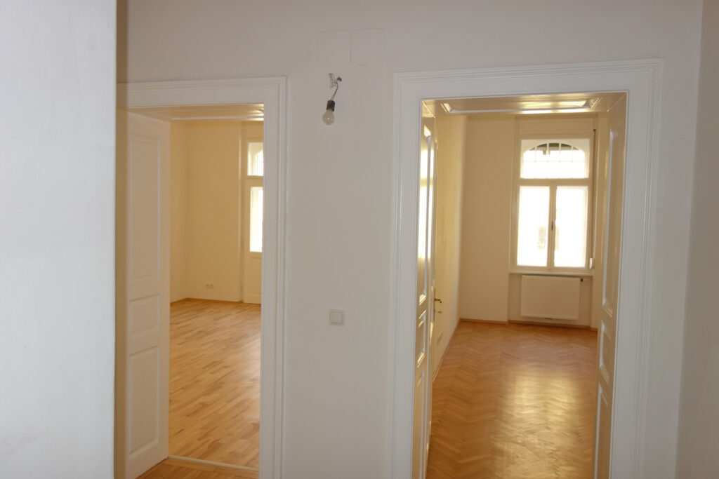 Hohe Räume mit sanierten Altbau Kassettentüren in weiß