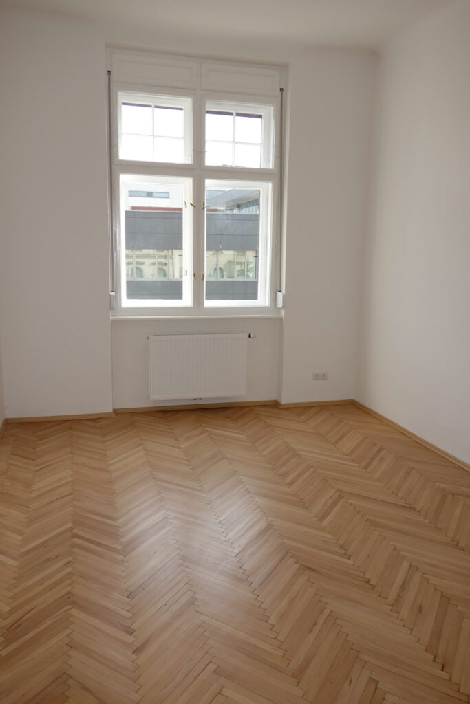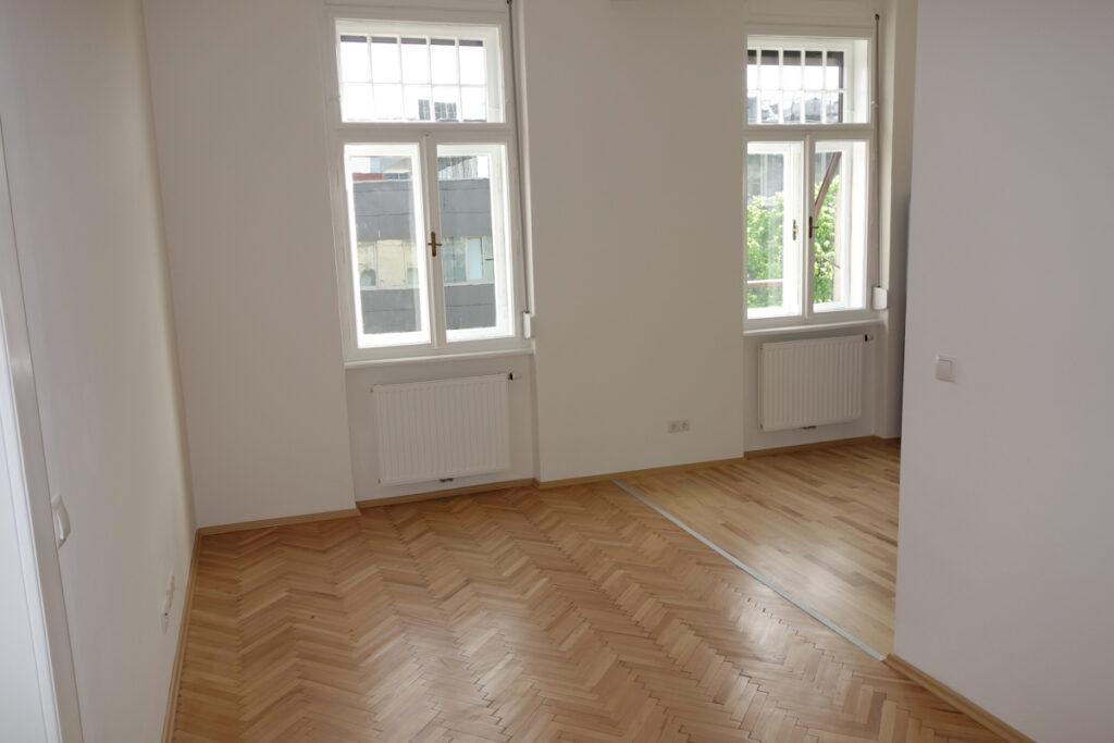 Sanierte alte Fischgrätparkettböden (wo wir sie erhalten konnten) bzw. Fertigparkett