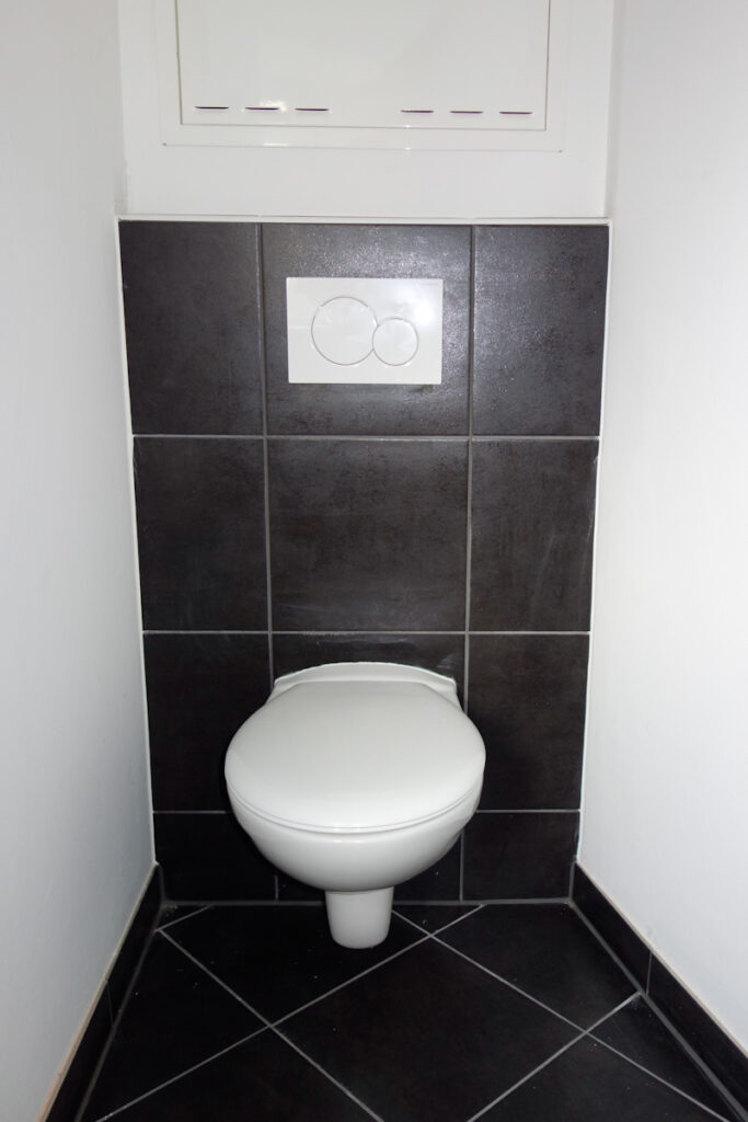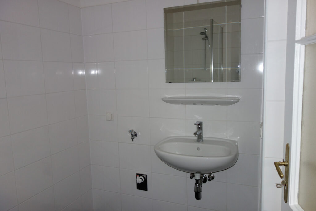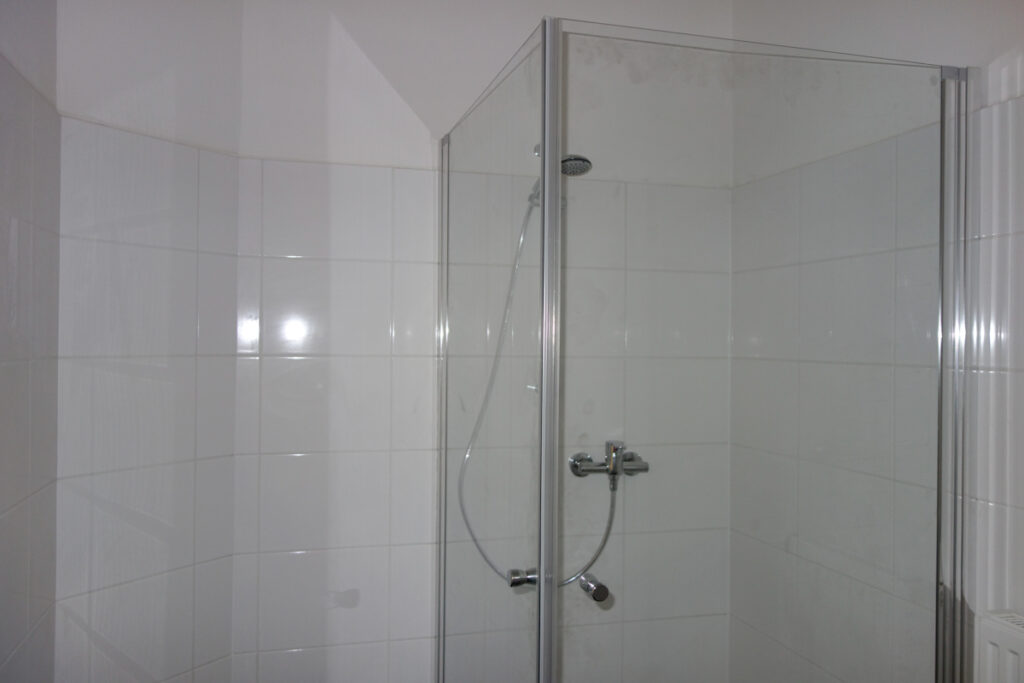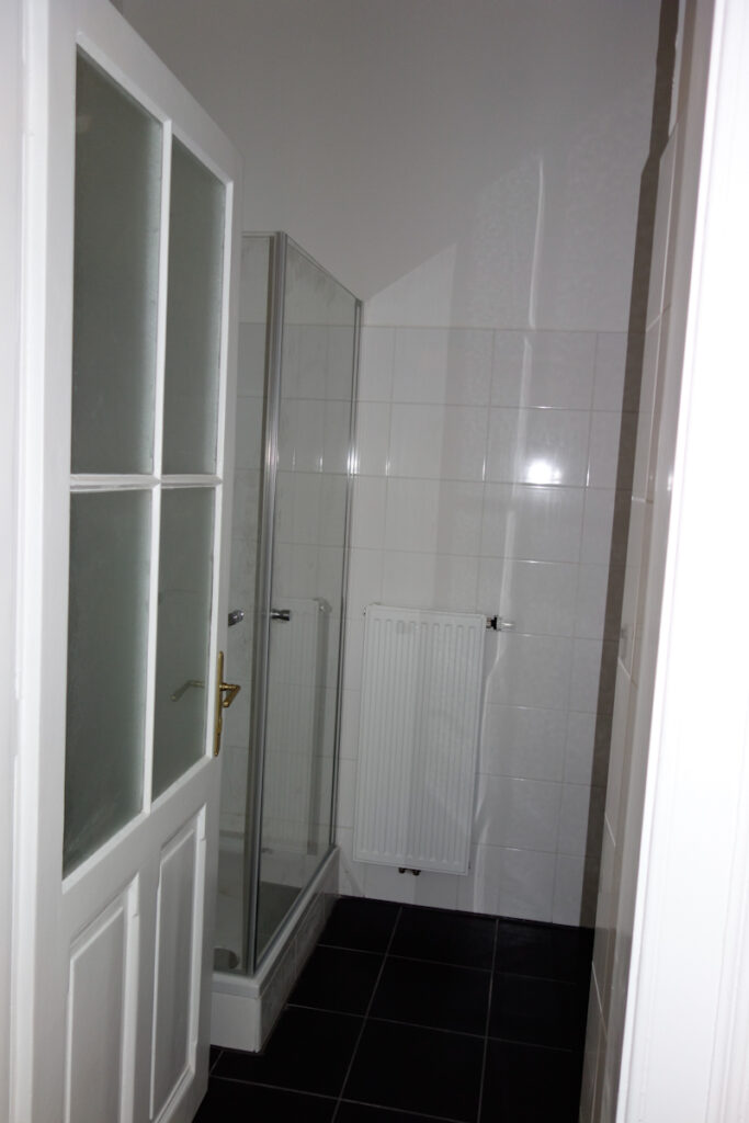 Völlig neu gestaltetes Bad mit Dusche 90/90, Wandfliese weiß, Bodenfliese antrazit, Anschluss für Waschmaschine, seperates WC