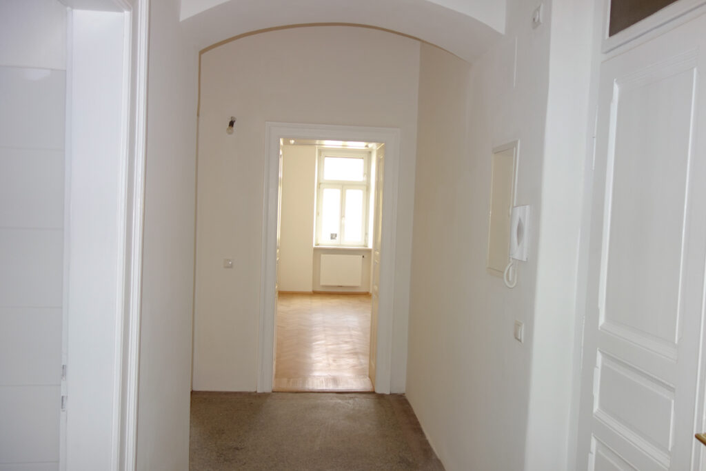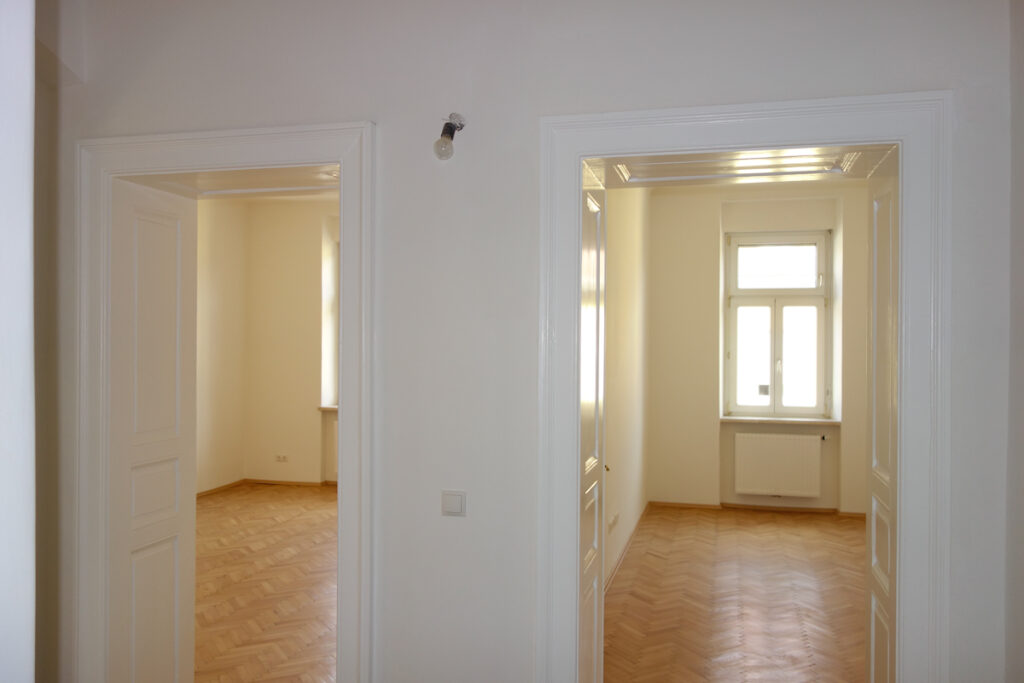 Hohe Räume mit sanierten Altbau Kassettentüren in weiß